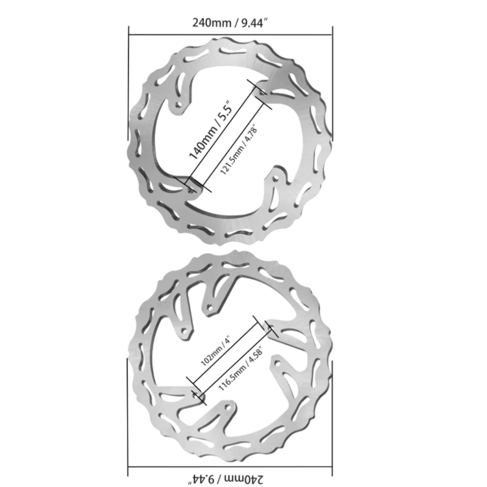 Os discos de freio são fabricados em aço inoxidável de alto carbono 420, utilizando o melhor processo de produção. O design ondulado da parte externa do disco ajuda a manter as pastilhas de freio limpas e a dissipar o calor, oferecendo desempenho de frenagem excepcional e mínimo desgaste das pastilhas.